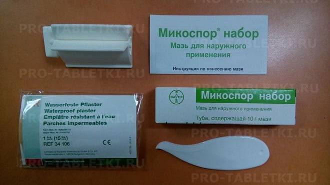 Мазь в составе набора Микоспор содержит два компонента, усиливающих антимикотический эффект друг друга. Мочевина размягчает кератин ногтя, тем самым улучшает проникновение противогрибкового бифоназола. Набор содержит необходимые инструменты для проведения процедуры удаления ногтя – пилка-скребок для отслоившегося ногтя, пластыри для прочного закрепления состава мази, дозатор для мази.