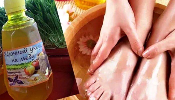 Готовим уксусную вaнночку для ног следующим образом: в емкость с теплой водой (2 л) добавляем стакан уксуса (лучше яблочного) и разводим его.