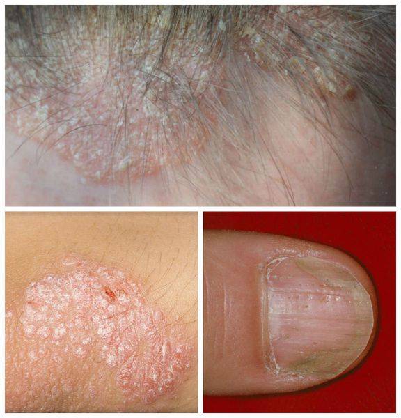Псориаз волосистой части головы сопровождается появлением розовых или красных пятен, чешуйчатых бляшек с чётко ограниченными краями. Диагноз облегчается в случае обнаружения бляшек на других участках кожи или типичных поражений ногтей.