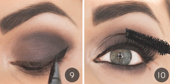 - После бровей женщине следует перейти непосредственно к глазам. Как правило, здесь работают два приёма – нанесение туши на ресницы для того, чтобы они были более объёмные и пушистые, а также подводка кожи век, как для верхнего, так и для нижнего, нередко с нанесением стрелок для формирования лисьего взгляда. Для тех, кому не хватает просто стрелки, можно воспользоваться тенями и выделить верхнее веко целиком.