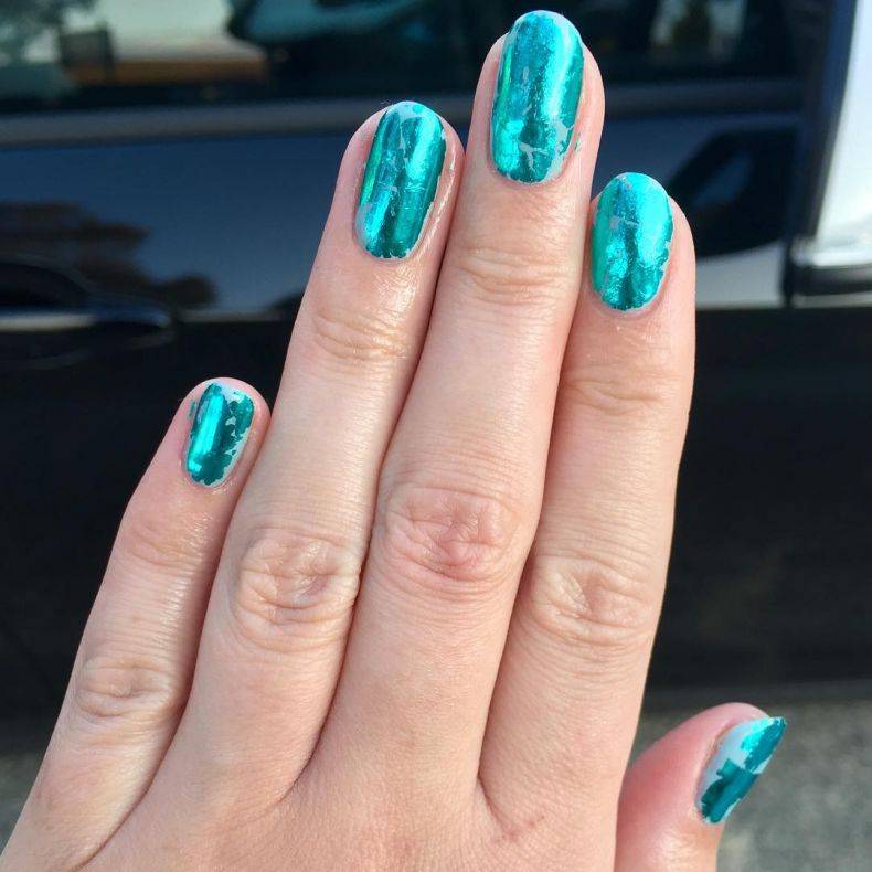 - После следует разместить на ногтевой пластине отрывную фольгу, хорошенько расправить и резко дернуть.