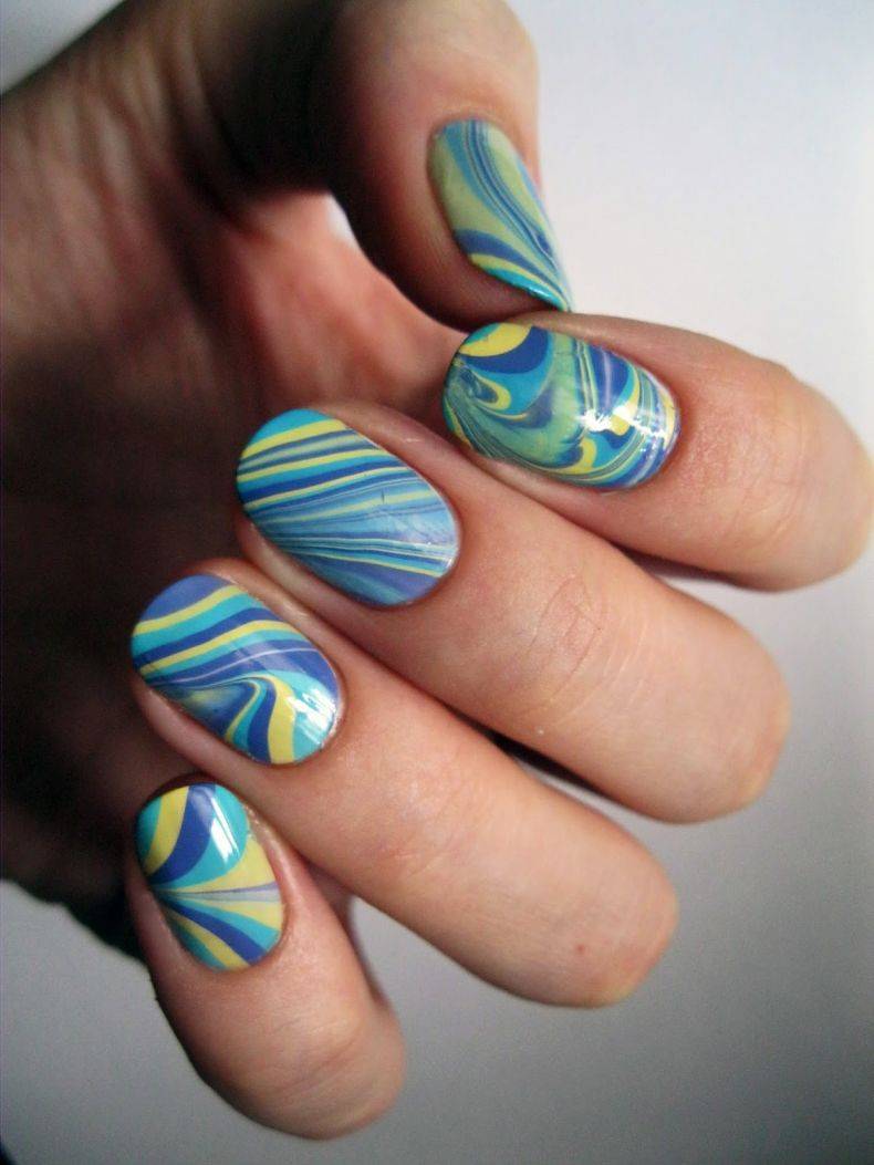 Для того чтобы водный маникюр выглядел более ярко, в качестве основы можно использовать лак яркого цвета, однако нужно учитывать, что другие цвета тоже должны быть яркими, иначе они будут выглядеть блекло.