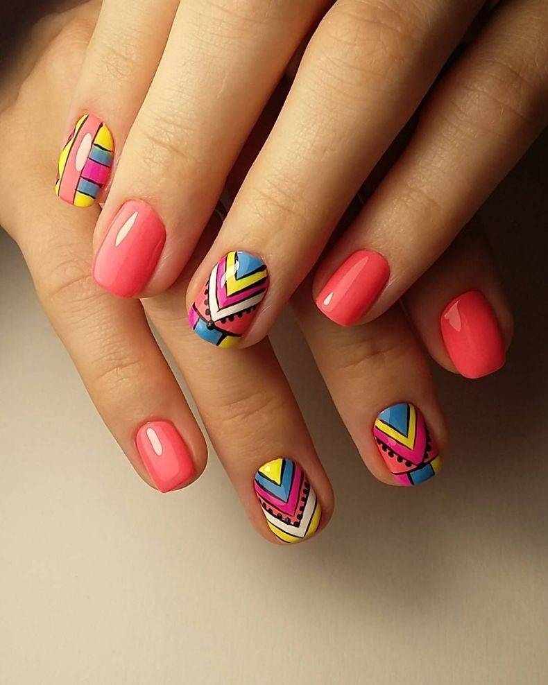 Проще всего сделать на ногтях точки, линии и другие геометрические фигуры. Они могут наноситься упорядочено или хаотично. В самом начале ноготь покрывается базовым цветом. После того, как слой лака подсохнет, при помощи кисточки рисуются линии, а иголкой можно нанести аккуратные точки.
