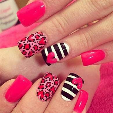 Еще несколько лет назад сочетание в одном образе одежды с разными принтами (например, полоски и горошка) считалось верхом безвкусицы. Но сегодня мы видим, что правило раздельного использование расцветок не такое уж и строгое. Например, леопардовый принт на ногтях на фото вполне удачно подружился с зеброй.