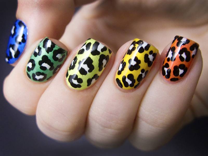 Не можете выбрать цвет для леопардового принта на ноготках? Растерялись в обилии оттенков? Тогда используйте их все вместе! Создайте радужный маникюр с разноцветными пятнышками. Но помните, что в этом случае основа должна быть спокойной и нейтральной, а обводка пятнышек классического черного цвета.