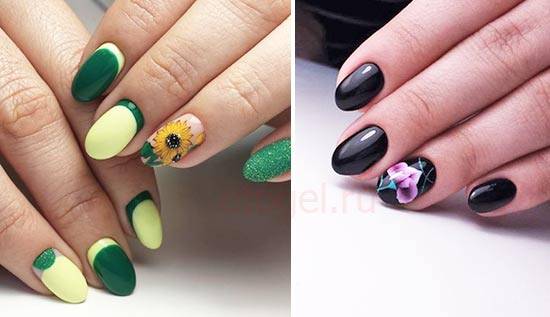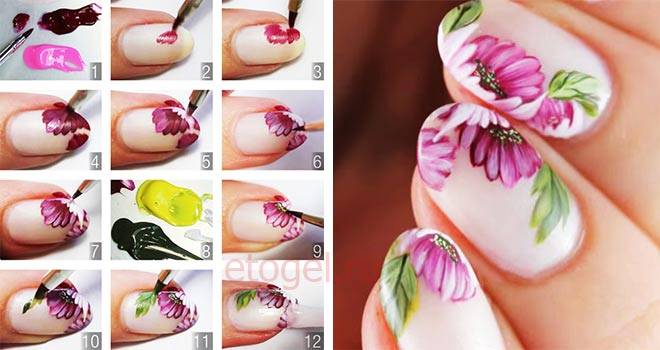 - Цветочным орнаментом с изображениями любимых цветов. Для начала можно попробовать нарисовать обычные ромашки. Сделать такой рисунок смогут даже новички: ставим на середину ногтя маленькую желтую точку, а вокруг нее рисуем короткие полукруглые линии – лепестки. Технологии создания более сложных узоров можно научиться, посмотрев видео о рисунках акрилом на ногтях;