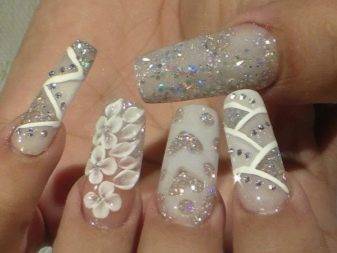 Маникюр с лепкой хоть и считается самым модным и красивым, но процесс его создания довольно кропотлив. На каждую ногтевую пластину наносится специальный материал, из которого формируют узор или рисунок, а потом все это закрепляется прозрачным гелем. Также мастера часто в своих работах используют слюду, кружево, фольгу или глиттеры. Это придает маникюру особую изюминку.