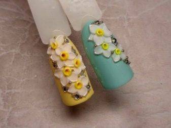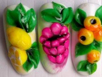 Кроме акриловой лепки, в объемном дизайне также применяют акриловые краски, которые подходят для создания мелких деталей. Объемные рисунки на ногтях могут использоваться как дополнение к уже созданному дизайну.