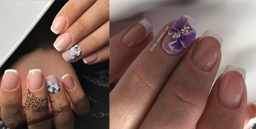 Эталоном классики для многих модниц является сегодня элегантный французский маникюр. Благодаря своей универсальности и богатому выбора идей оформления френч остаётся востребованным как для повседневного использования или для делового стиля, так и для торжественных луков. Разнообразные фактурные узоры прекрасно сочетаются с прозрачной основой и белым кончиком. Светлые оттенки основы с объёмными рисунками наполняют образ романтическими нотками. Если вам по душе более яркие тона, выполняйте лепку в более насыщенном цвете и поэкспериментируйте с выбором цвета улыбки и основного покрытия.