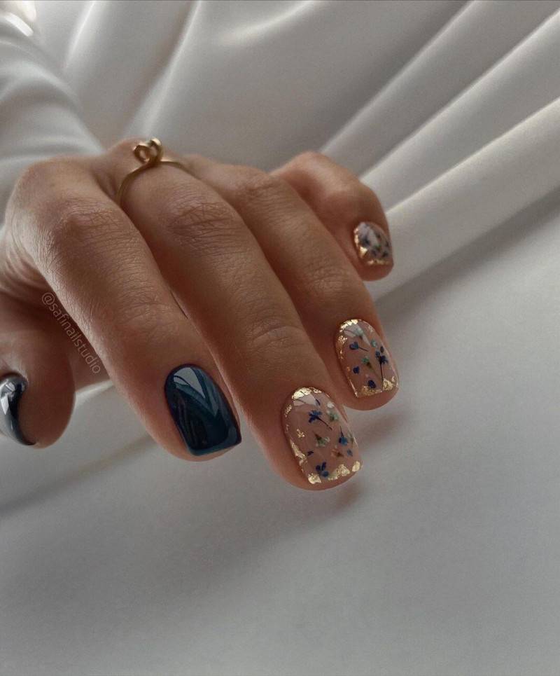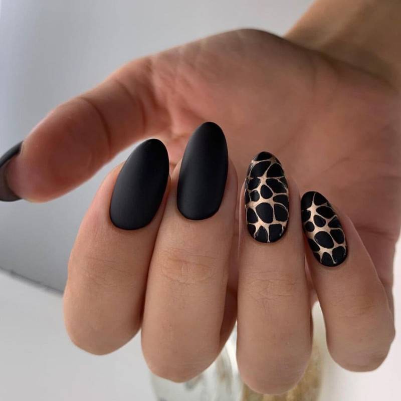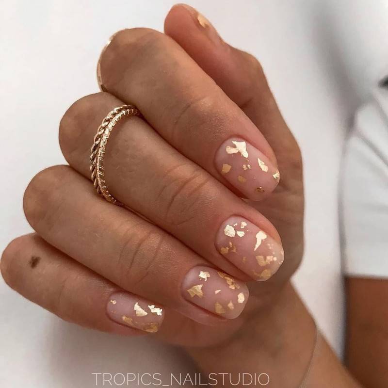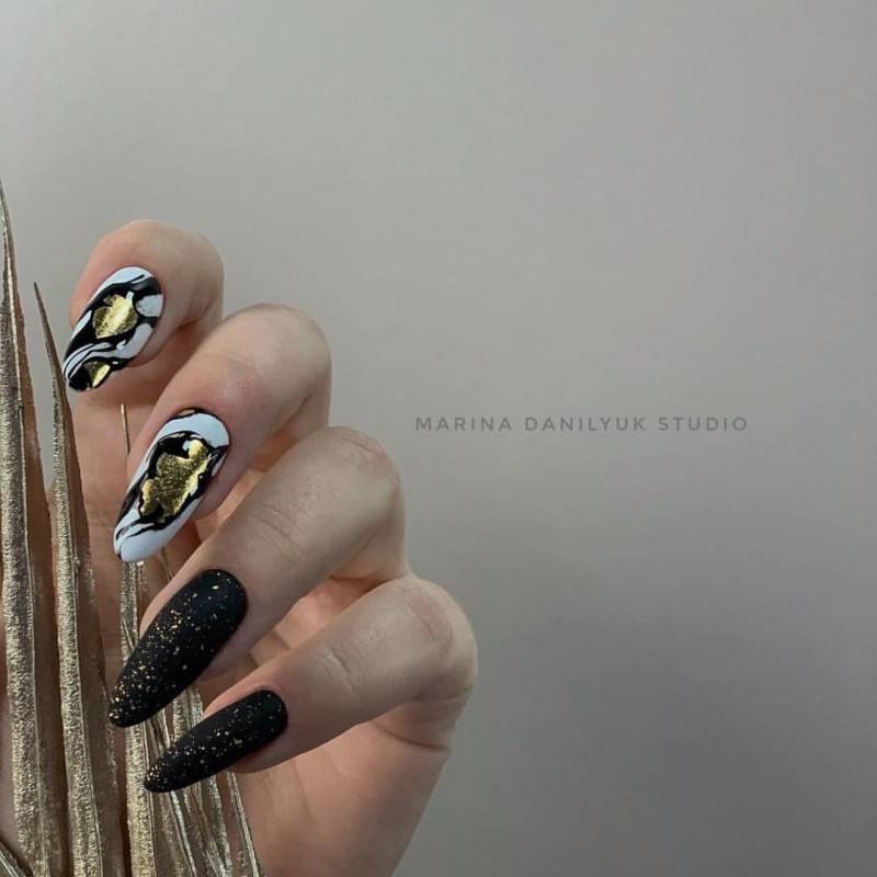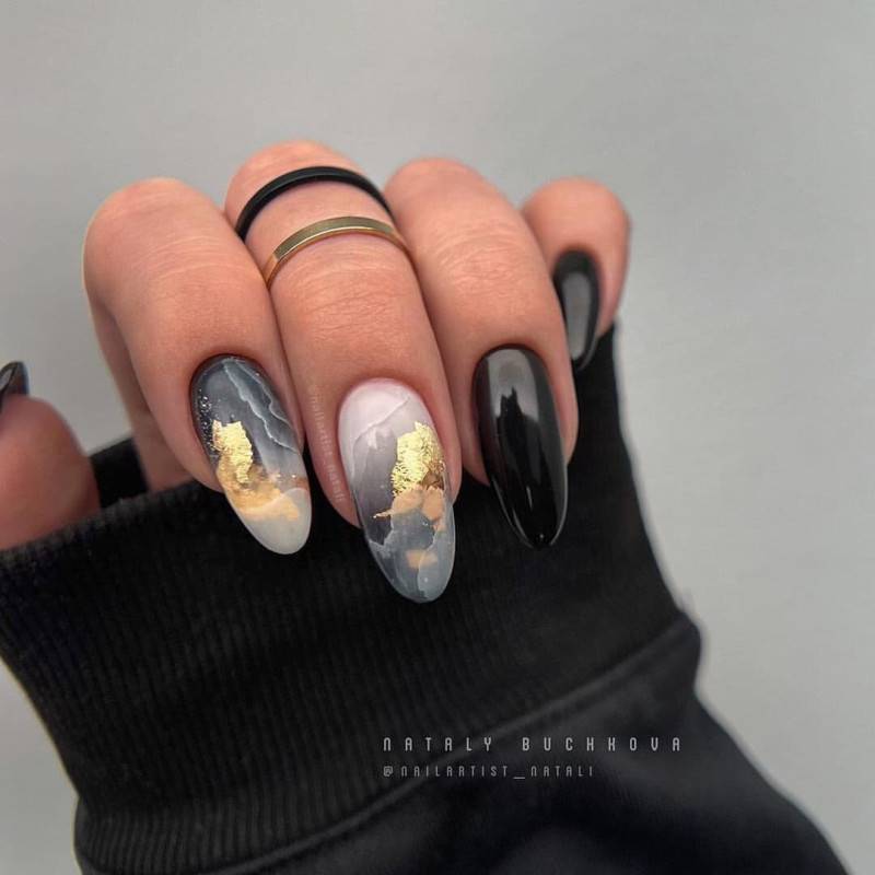 В 2022 году модным останется смешивание разных техник, которые помогут создать необычный образ. Например, геометрические фигуры, выполненные золотистыми или серебристыми полосками, или паутинка с узором из фольги на покрытии темного цвета.