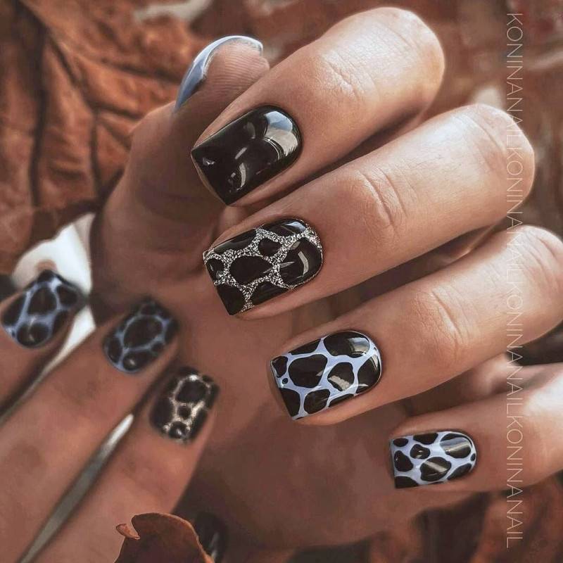 В таком маникюре великолепно проявляет себя и актуальная темная гамма. Например, стильно будет смотреться изысканное сочетание черного и серого цвета.