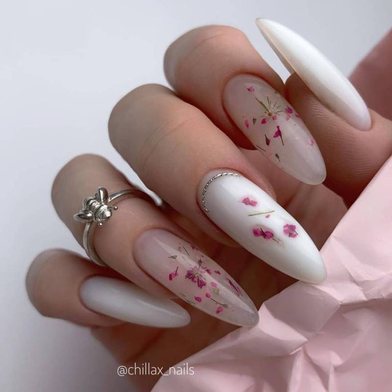 В 2020 сезоне жемчугу уделяется большое внимание во всех сферах моды, в том числе и в маникюре. Как вы уже догадались, для актуального воплощения нейл-арта, следует ограничиться в количестве подобного декора. Например, весьма необычно будет выглядеть жемчуг в качестве сердцевинки летних цветов