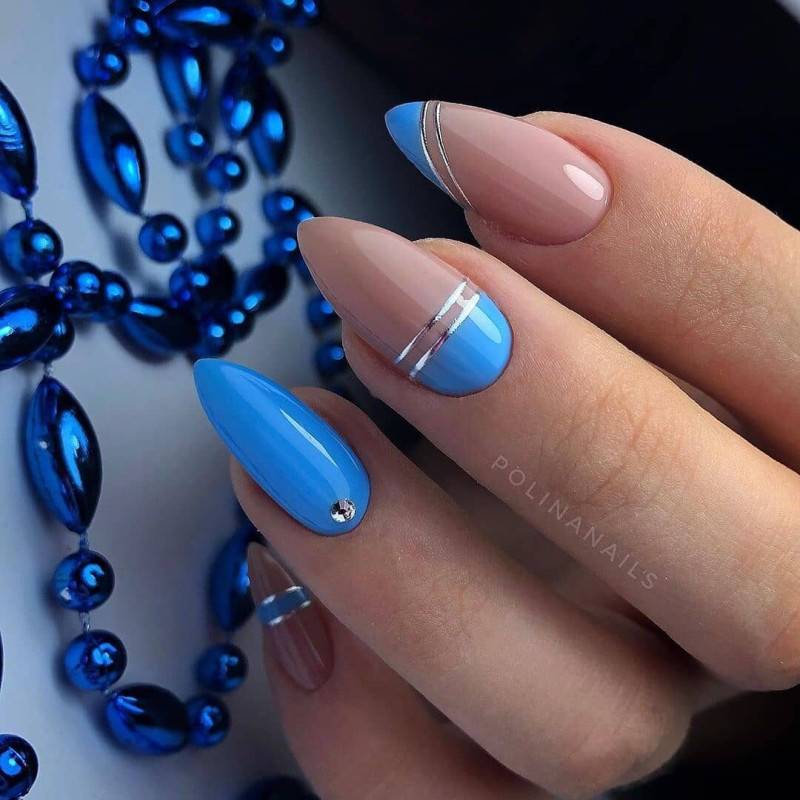 Вместе с модными синими и голубыми акцентами потрясающе будет смотреться фиолетовый лак. Это одна из самых красивых и стильных комбинаций 2020 года!