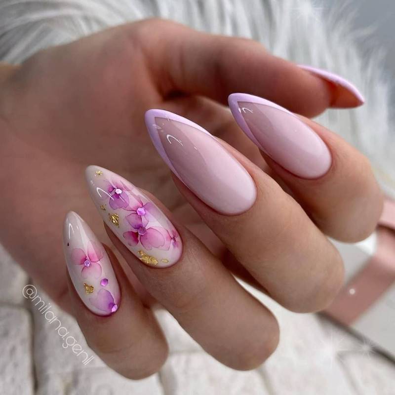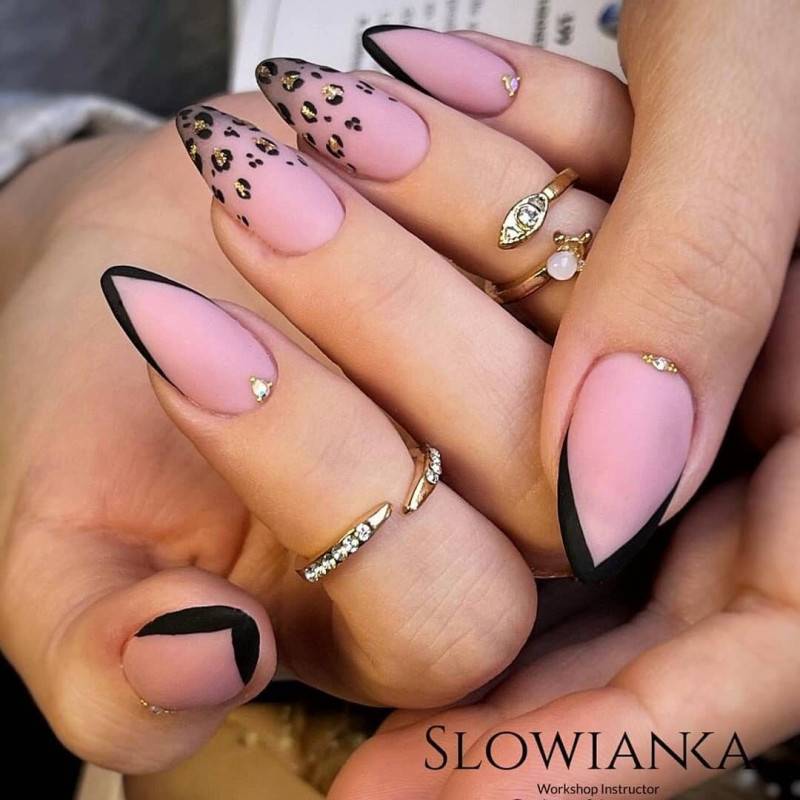 Также вы можете сочетать этот дизайн с блестками или стразами. В моду возвращается леопардовый френч, он подойдет более смелым и ярким девушкам. Более утонченно и нежно будет смотреться союз с цветочными мотивами и бабочками. Также можно попробовать поэкспериментировать с формой — в 2022 году актуален френч на миндальных и острых ногтях.