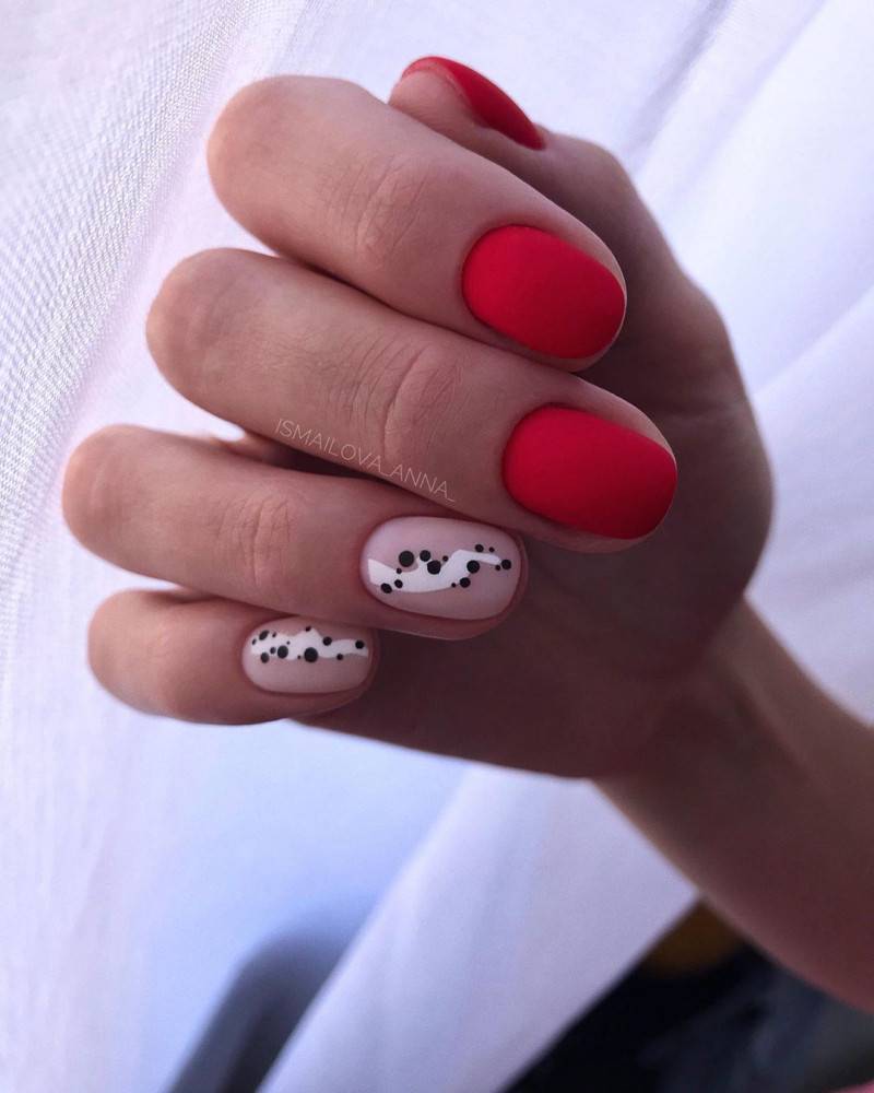 Для любительниц классики подойдет красный маникюр. Он актуален в любое время года. Очень круто смотрится в тандеме с блестками и стразами. Без дизайна выглядит не менее круто, особенно в матовом выполнении. Этот оттенок пользуется спросом у девушек всех возрастов и статусов.