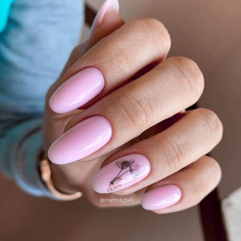 Нежный розовый маникюр нанесенный на короткие или длинные ногти смотрится мило и романтично. Что касается видов дизайнов, летом нежно-розовый может быть усыпан цветами, дополнен фруктовым, растительным или ягодным принтом.