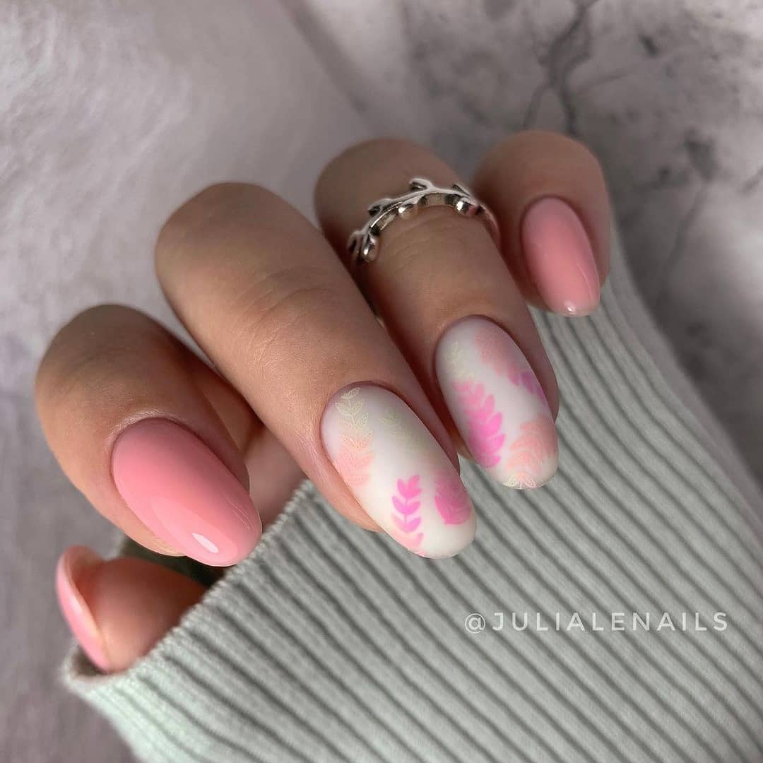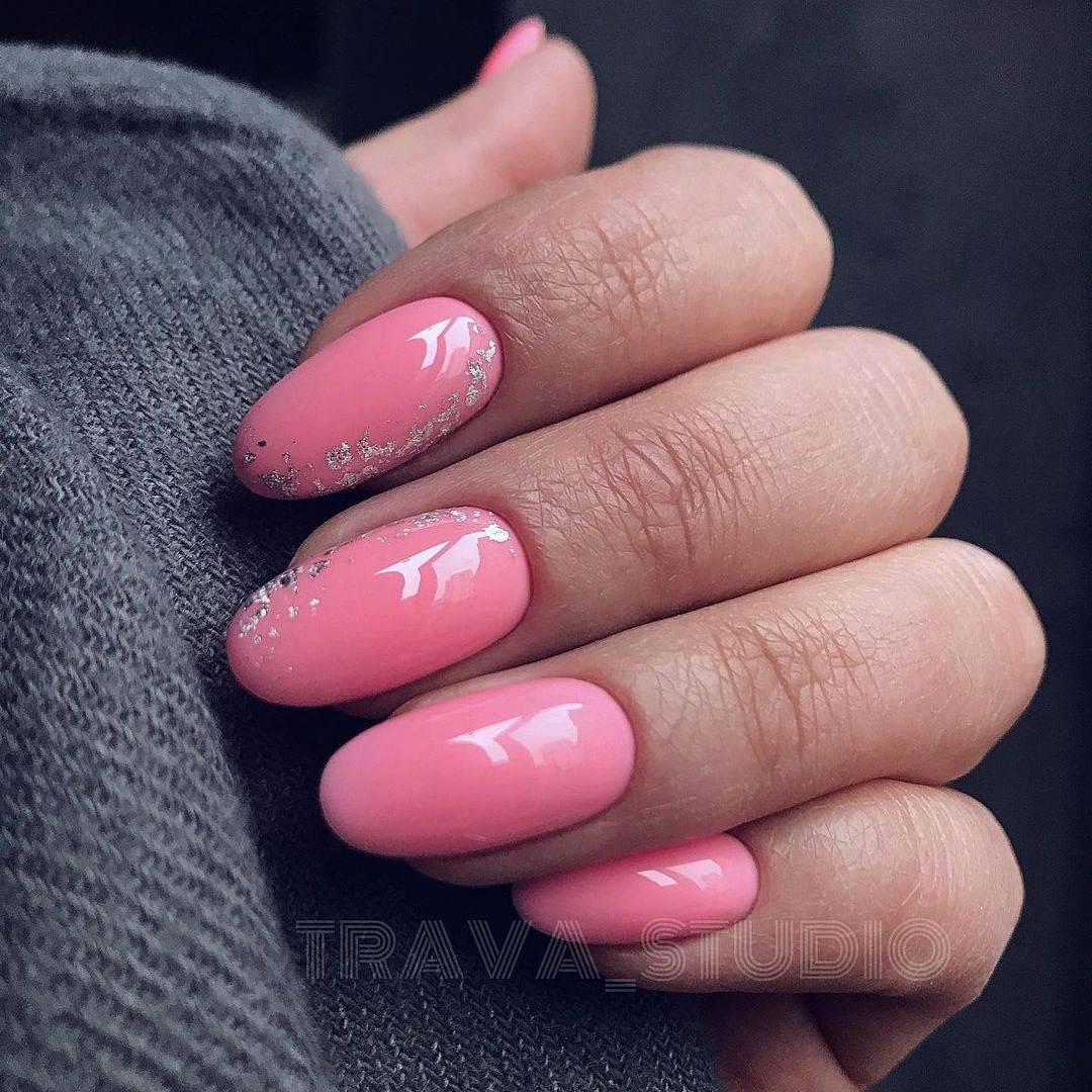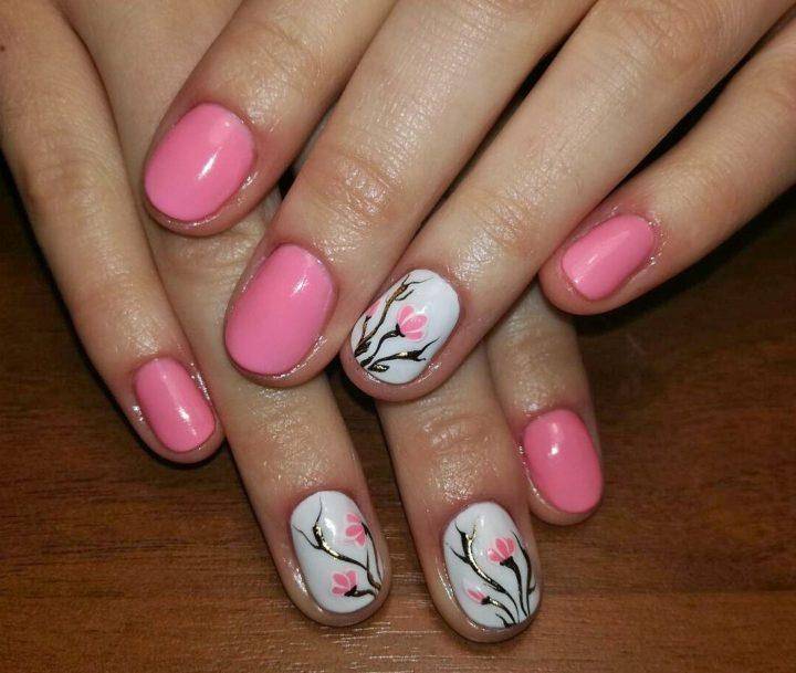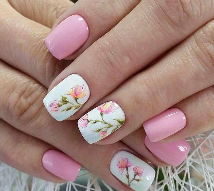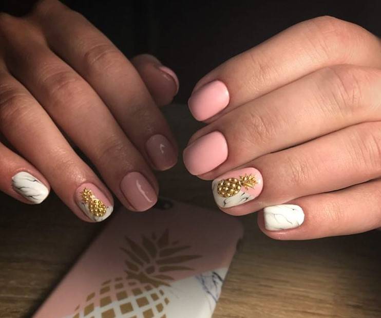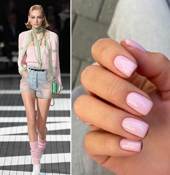 Нежный розовый маникюр нанесенный на короткие или длинные ногти смотрится мило и романтично. Что касается видов дизайнов, летом нежно-розовый может быть усыпан цветами, дополнен фруктовым, растительным или ягодным принтом.
