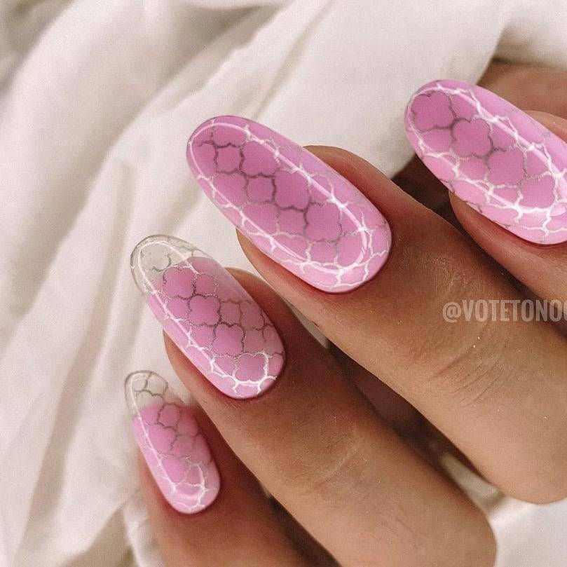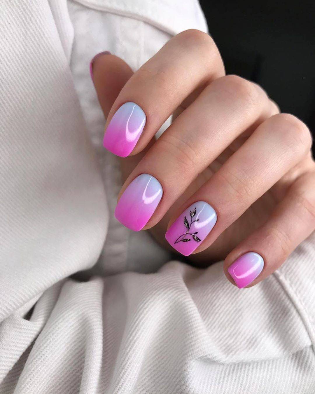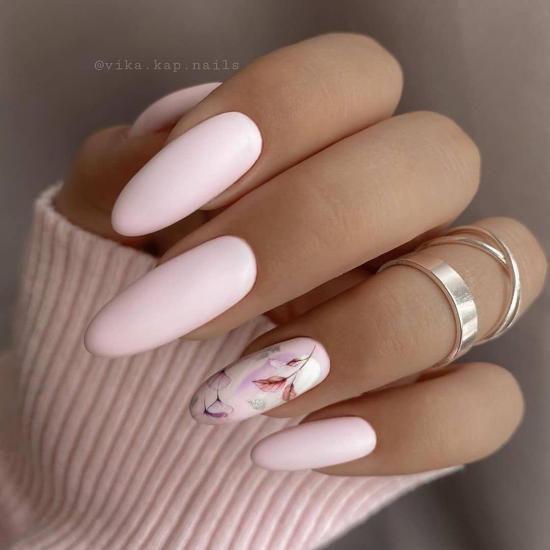 Нежный розовый маникюр нанесенный на короткие или длинные ногти смотрится мило и романтично. Что касается видов дизайнов, летом нежно-розовый может быть усыпан цветами, дополнен фруктовым, растительным или ягодным принтом.