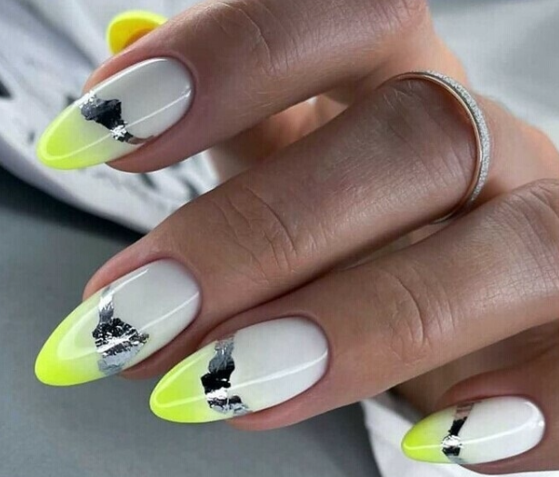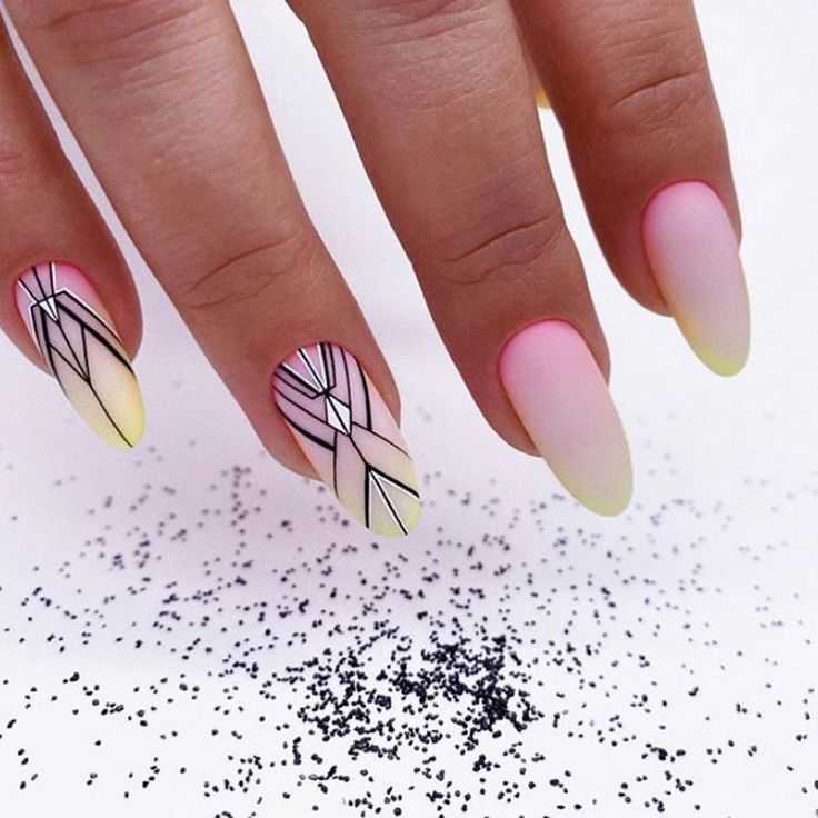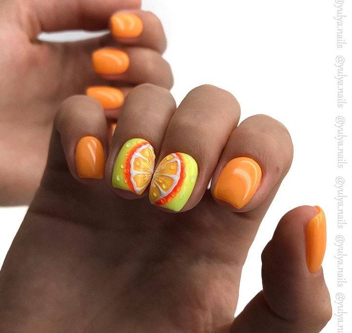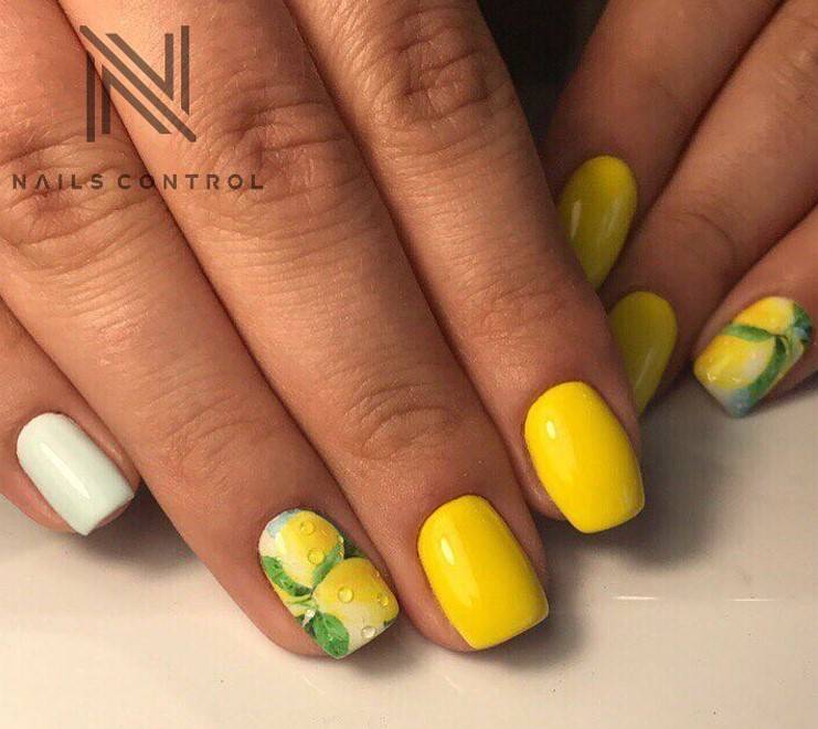 При создании дизайна обратите внимание, что в качестве основы следует выбирать самый светлый оттенок гель-лака. Отличным вариантом станет подложка лимонного цвета. Сверху ногти покрывают серым, оранжевым и розовым гель-лаком