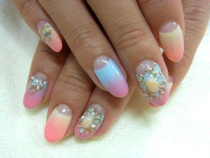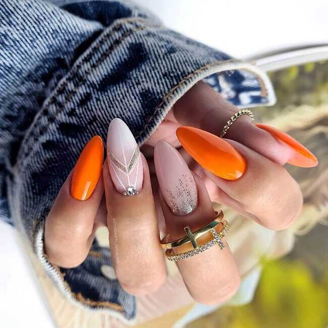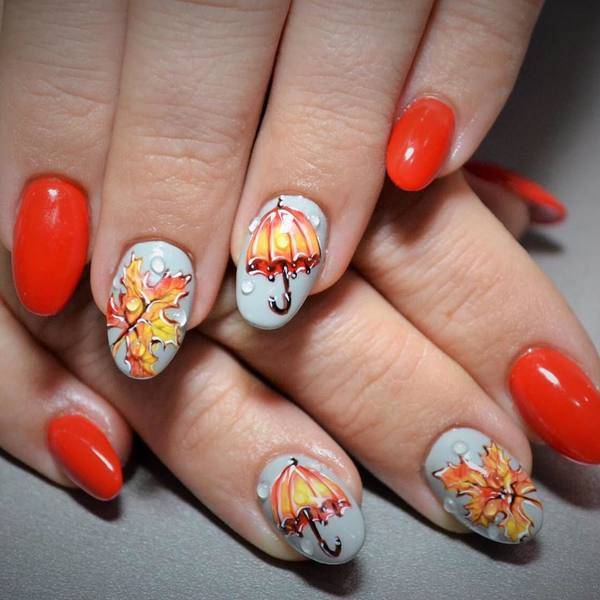 Сверху ногти покрывают серым, оранжевым и розовым гель-лаком. Для более яркого эффекта можно сверху нанести прозрачный блестящий слой.