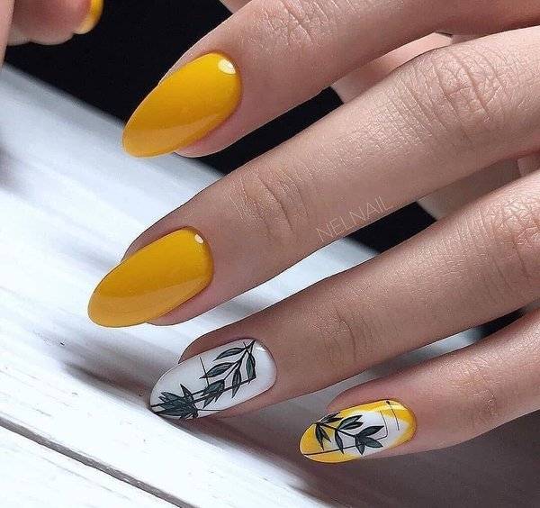 Фантазия нейл-мастеров не иссякнет никогда. В этом году они предлагают свежие идеи с природными мотивами. В данном случае речь идет о тропическом маникюре, который отличается особой яркостью. Он предполагает стильное сочетание ярких крупных листьев с геометрическими деталями. Это могут быть фигуры и полоски, которые добавляют дизайну сдержанности. В свою очередь, листья могут быть нарисованы вручную, чтобы детали выглядели максимально натурально. Втирка, фольга и блестки — прекрасное украшение, которое помогает сделать дизайн более заметным, активным. Но в данном случае многое зависит от размера рисунка.