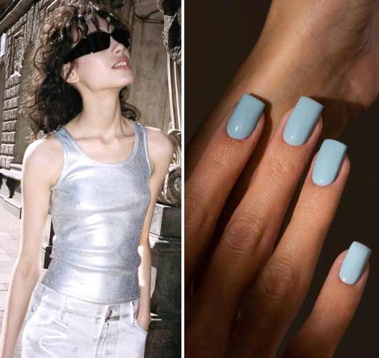Комбинируйте с другими модными пастельными оттенками, например, розовым, молочным. Сочетание светло-бирюзового лака с серебристым придают больше оригинальности летним дизайнам ногтей.