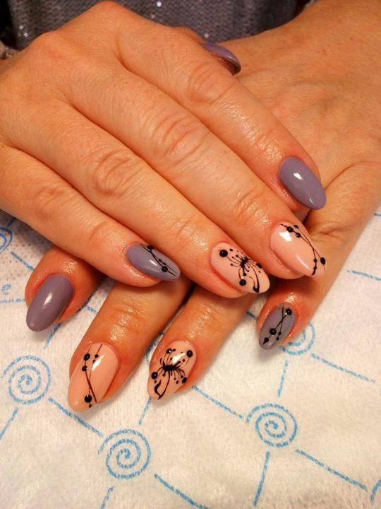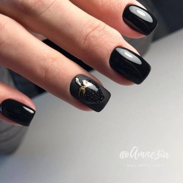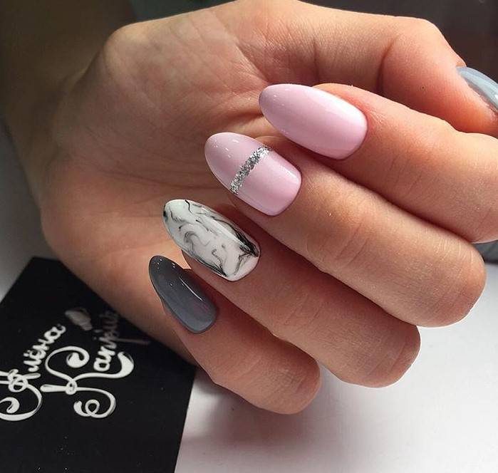 В таком маникюре великолепно проявляет себя и актуальная темная гамма. Например, стильно будет смотреться изысканное сочетание черного и серого цвета.
