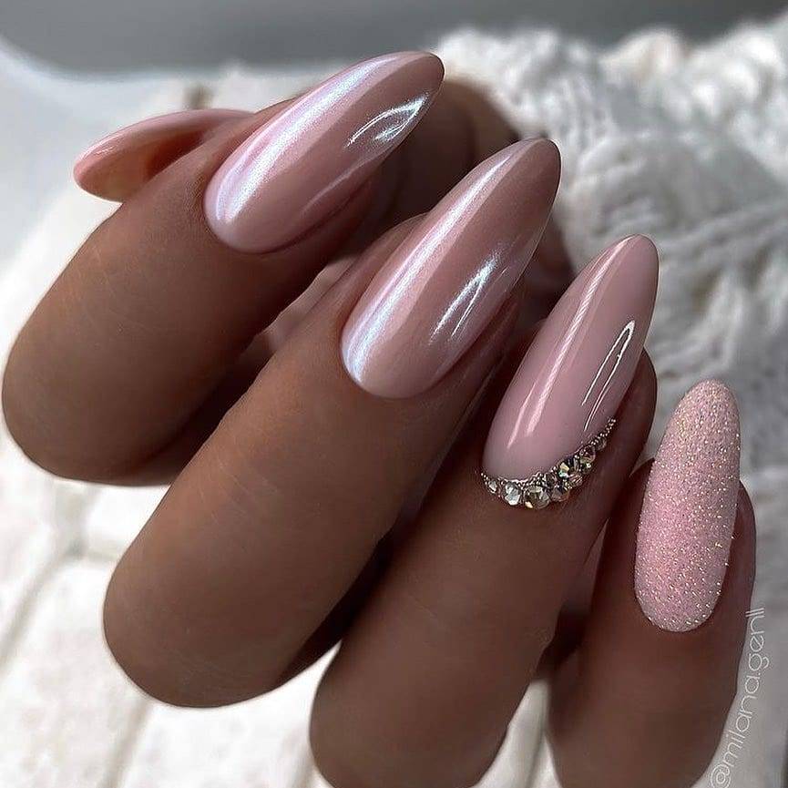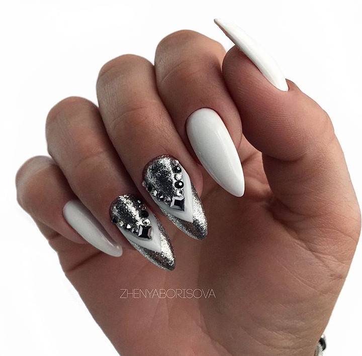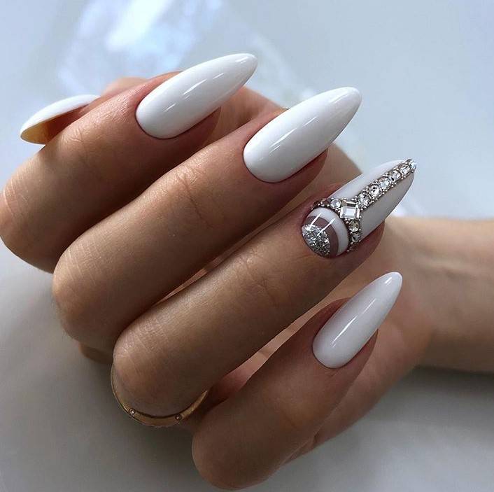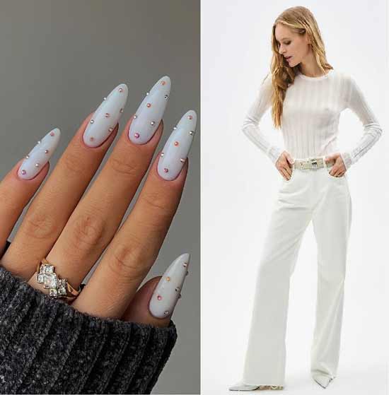 - Это нежный оттенок белого — он может добавить элегантности и изящества в дизайн ногтей со стразами.