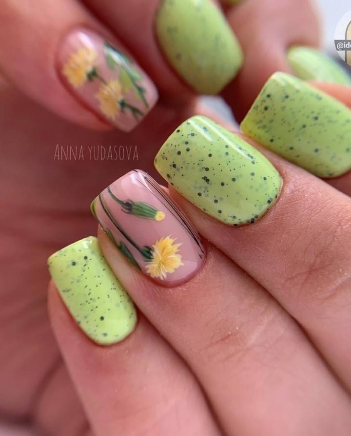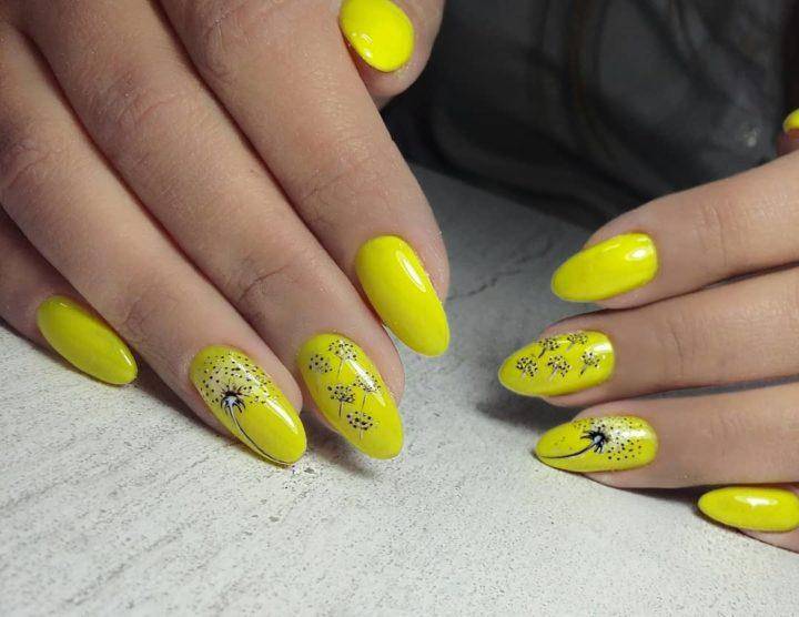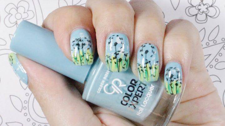 Идеи нейл-арт разнообразны: одуванчик может иметь разлетающиеся пушинки, а может быть целым цветком. Фон для создания рисунка может быть любой, но лучше всего сделать его ярким, ведь лето — это время красок.