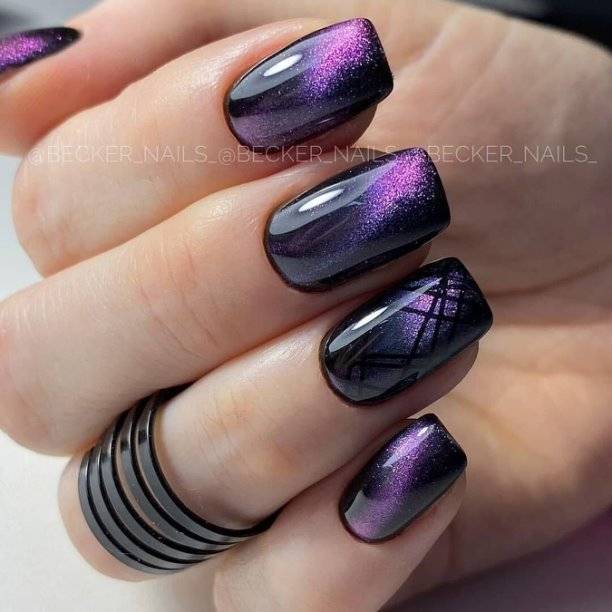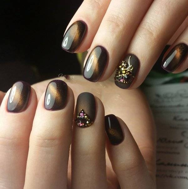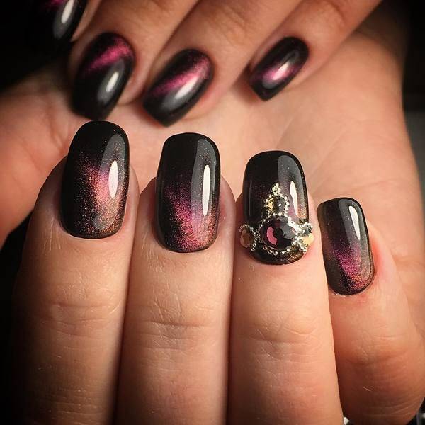 Он хорошо смотрится в сочетании с техникой «кошачий глаз». В таком оформлении манящие переливы сводят с ума своей эстетикой и глубиной. Если вам хочется сделать что-то креативное, можно добавить декор с помощью лепки. Такой вариант будет выглядеть выразительно и ярко