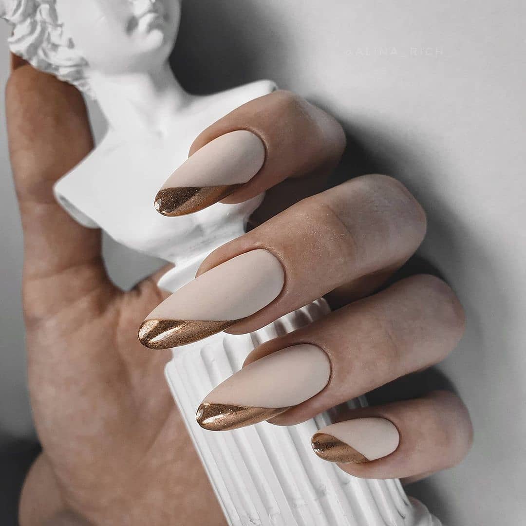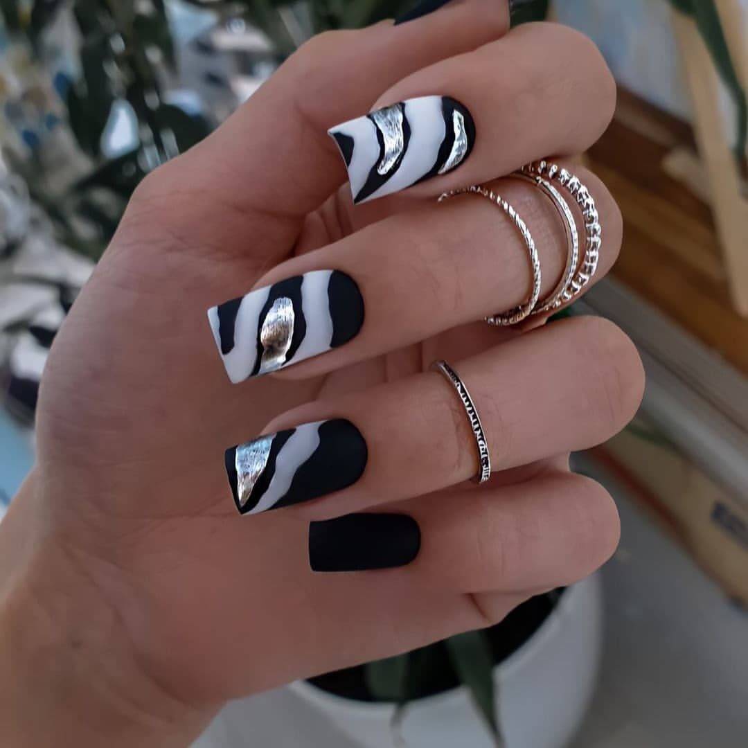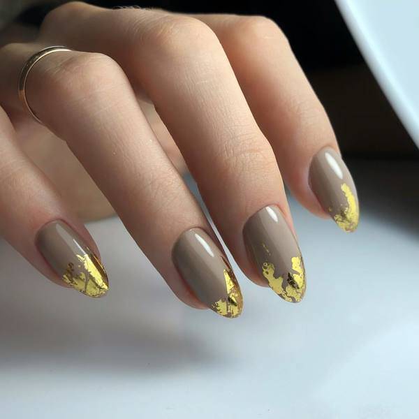В 2022 году модным останется смешивание разных техник, которые помогут создать необычный образ. Например, геометрические фигуры, выполненные золотистыми или серебристыми полосками, или паутинка с узором из фольги на покрытии темного цвета.
