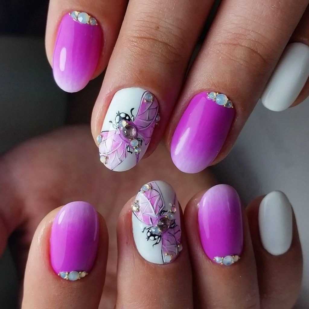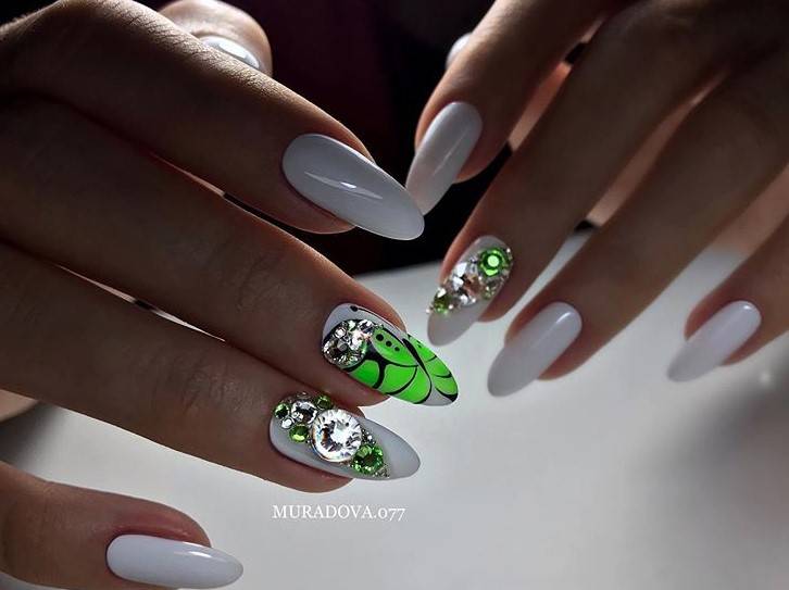 В летнем маникюре будет оправдано использование великолепных страз. Зачастую достаточно одного камня, чтобы итоговый нейл-арт был эффектным и стильным.