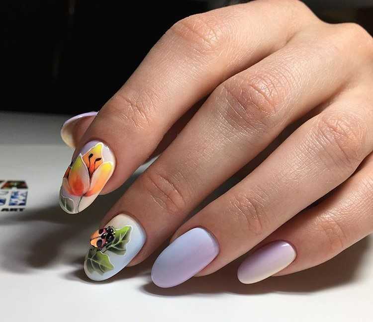 Новинка 2022 года — мазки кистью. Это один из самых простых способов создания креативного рисунка на ноготках. Здесь есть один нюанс: цвета гель-лака должны быть подобраны правильно, сочетаться между собой и создавать неповторимую иллюстрацию.