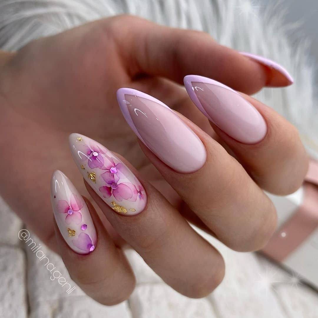 Также вы можете сочетать этот дизайн с блестками или стразами. В моду возвращается леопардовый френч, он подойдет более смелым и ярким девушкам. Более утонченно и нежно будет смотреться союз с цветочными мотивами и бабочками. Также можно попробовать поэкспериментировать с формой — в 2022 году актуален френч на миндальных и острых ногтях.