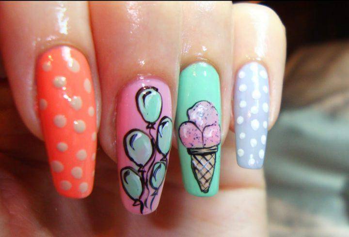 Изначально может показаться, что данный вид подойдет лишь детям. Но это не так. Воздушные шарики, выполненные на ногтях яркой палитрой, отлично подойдут на разный возраст женщины. Мало того это один из немногих рисунков, который отлично подходит на короткую длину ногтей.