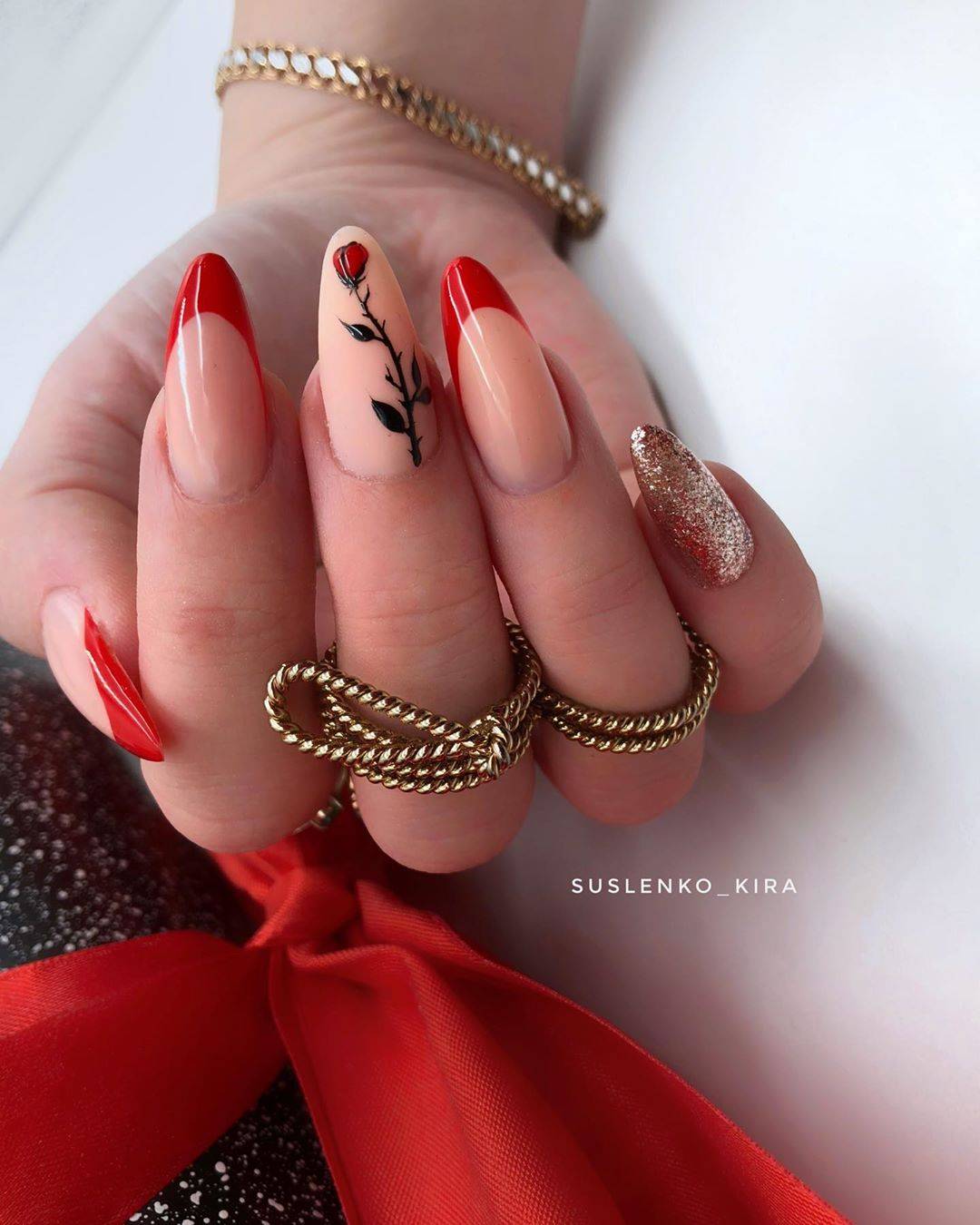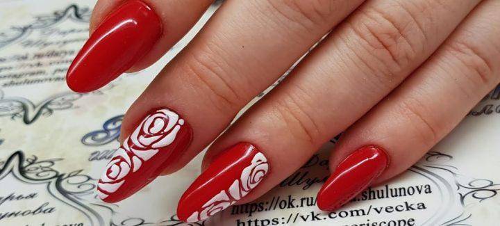 Более яркий и выразительный маникюр получится в красном цвете. Модницы довольно часто выбирают такой фон для дизайна на особый случай и украшают его эффектными сверкающими акцентами.