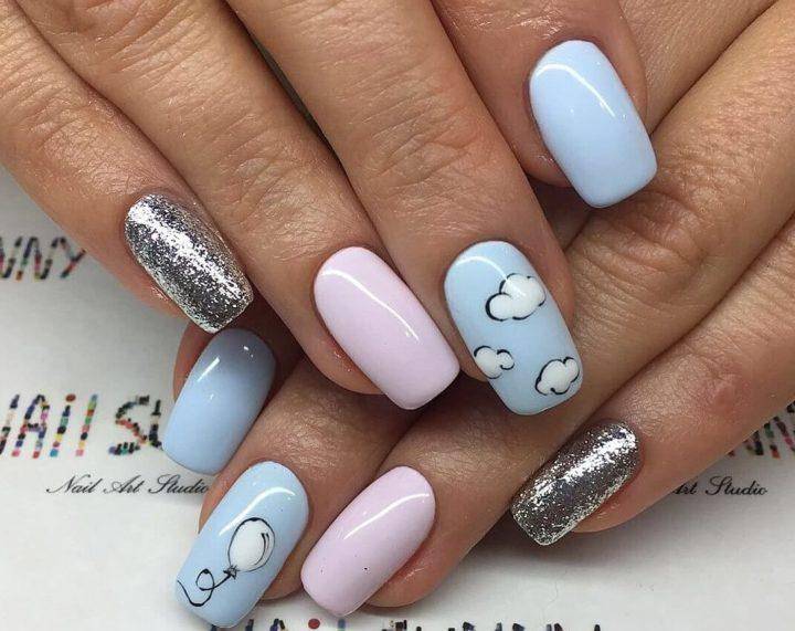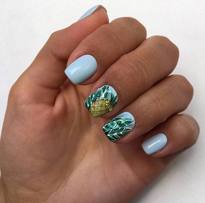 Попробуйте выбрать в качестве основы нежно-голубой лак. Сверху нанесите рисунки морской тематики. Для каждого пальца выбирайте разное изображение. Это могут быть ананас, пальма, якорь, фламинго и волны. Такой маникюр будет смотреться красиво и привлекательно.