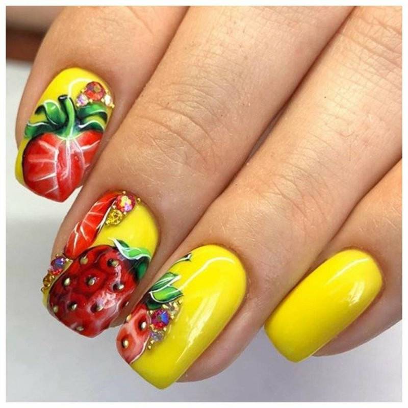 Если же такая тематики по какой-то причине не нравится либо уже надоела, то всегда можно подобрать другие варианты: например, сделать маникюр с бабочками, стрекозами или любыми другими животными или птицами либо же с фруктами или ягодами. Будет смотреться очень эффектно.
