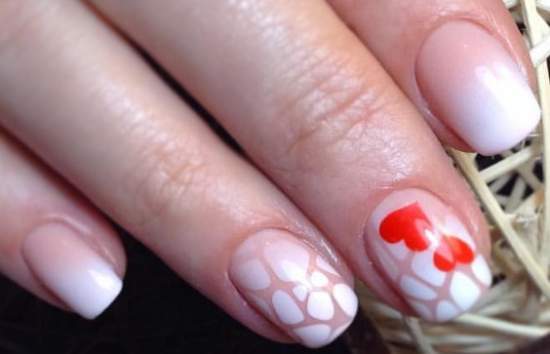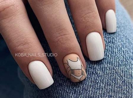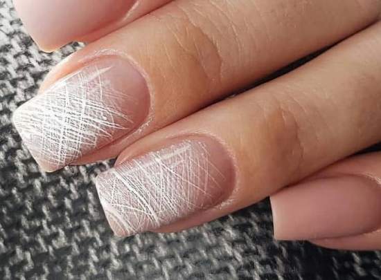 Нежный бежевый маникюр можно украсить рисунком белой краской «Паутинка». Такой дизайн в любое время года будет уместным. Он, как классический френч, подходит к любому наряду и случаю.