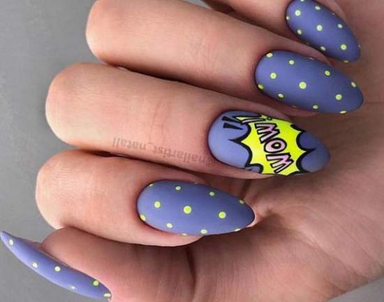 Популярный тренд – рисунки в стиле поп-арт. При наличии художественных навыков можно создать неповторимые шедевры на ногтях