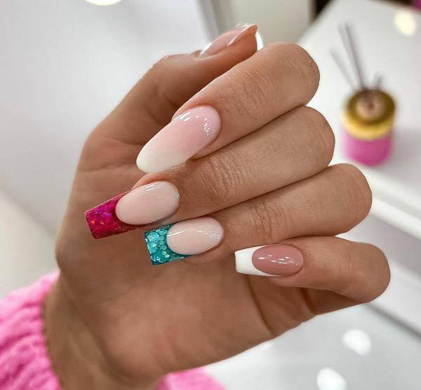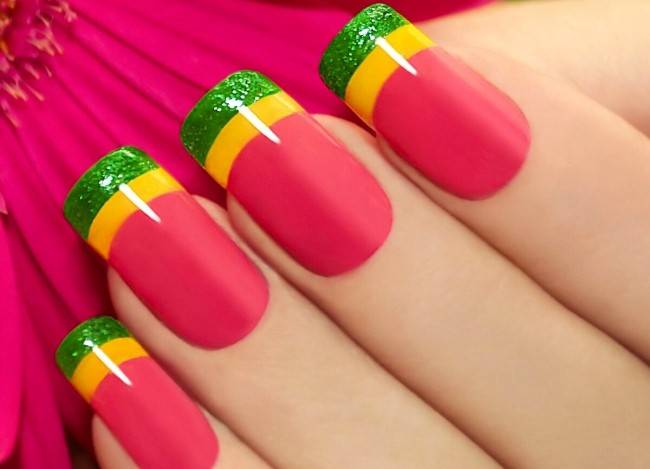 - Френч с использованием блесток, контрастных, ярких лаков.
