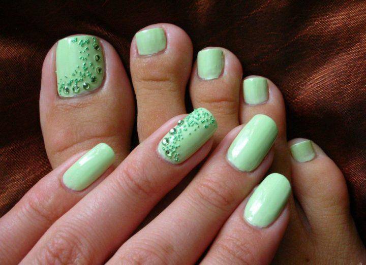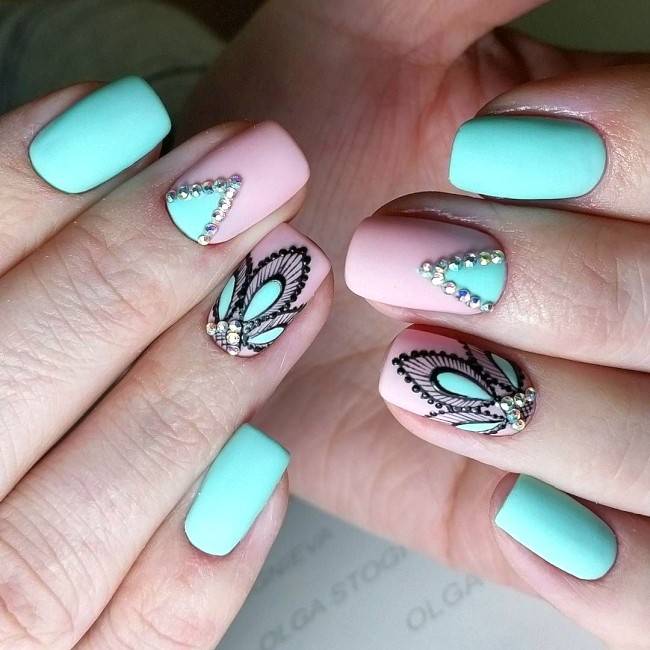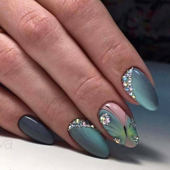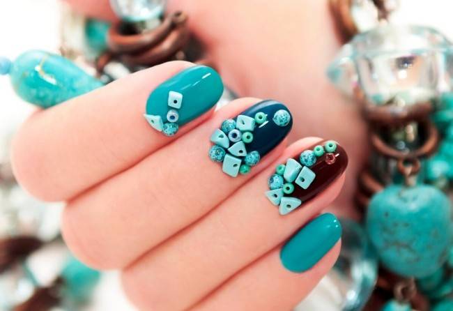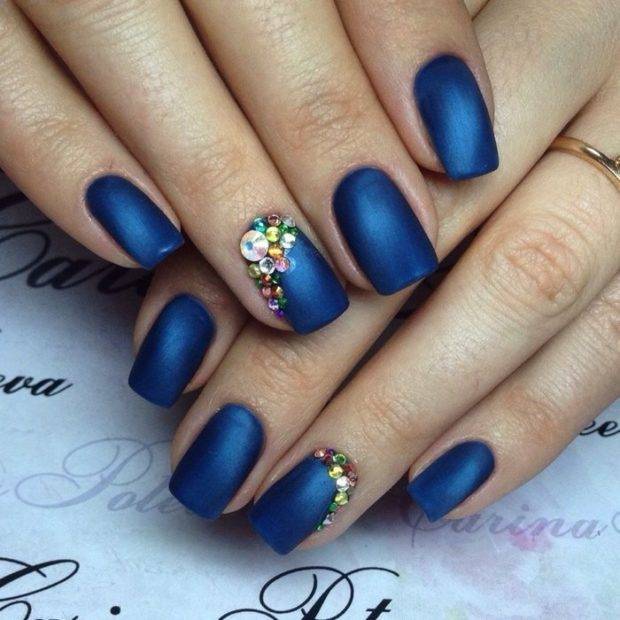 Ровные грани и яркий блеск имитируют драгоценность и делают ваши ногти по истине блестящими. Дизайн ногтей — это личное дело девушки, она подбирает свой стиль на основании собственных желаний. Используются камешки разной формы и размера. Каких-либо требований к цветовой гамме для ногтей нет. Модно будут выглядеть нежно-мятные и коралловые цвета.
