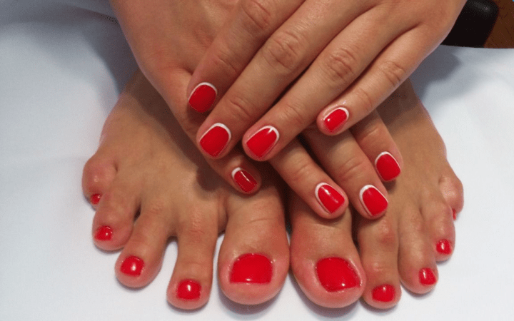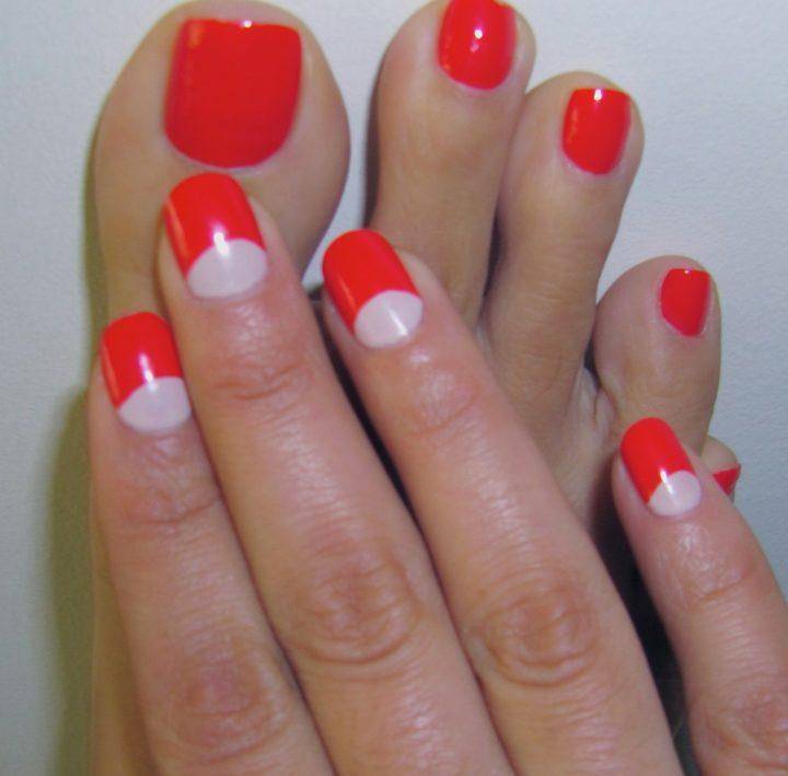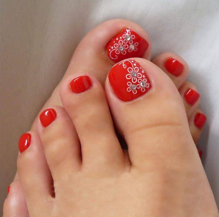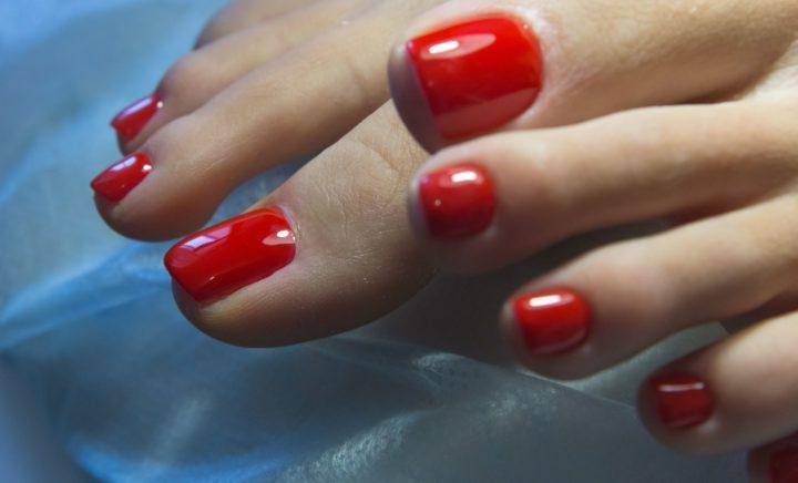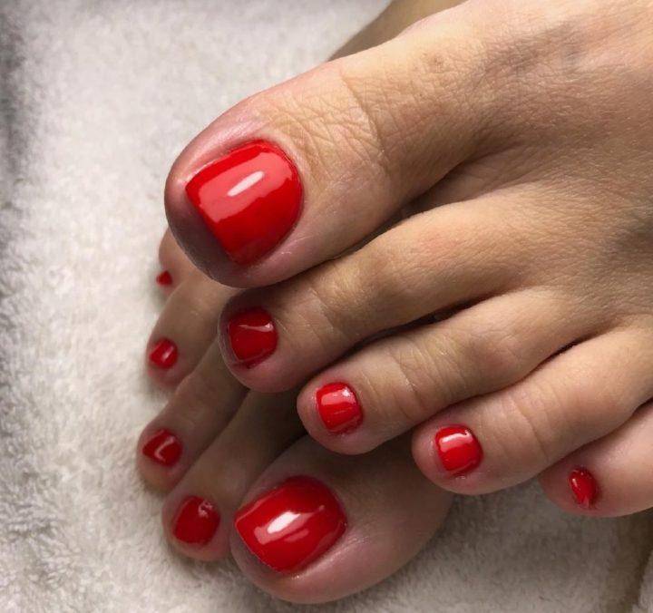 Красный лак привлекает много внимания, поэтому стоит заранее позаботиться о состоянии ваших стоп. И помните, что красный самодостаточный цвет, который не требует украшений, поэтому лучше всего его использовать в однотонном нанесении.