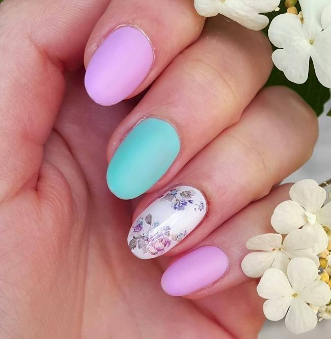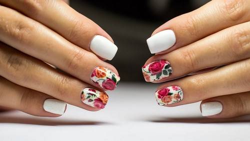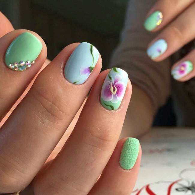 На коротких ногтях будет выигрышно смотреться любой цветочный нейл-арт как в ярких оттенках, так и в более приглушенных, нюдовых.