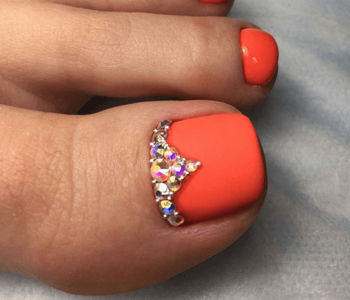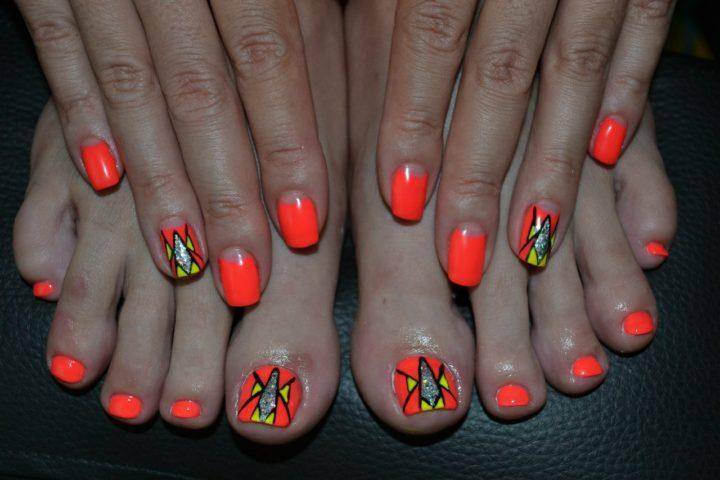 Чтобы образ смотрелся более гармонично мастера рекомендуют делать одинаковый оранжевый цвет лака на руках и ногах. Оранжевый можно дополнять серебряными стразами и черными рисунками.