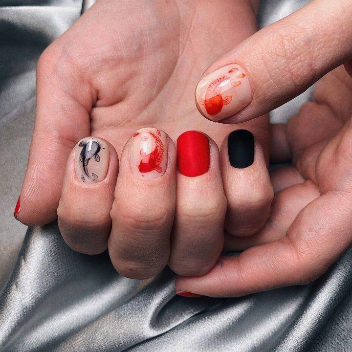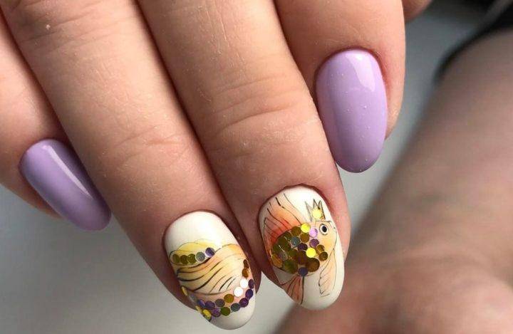Рыбный маникюр — это прекрасная идея для летнего отдыха на море. Он является альтернативой стандартному морскому дизайну, который не уступает ему в яркости и оригинальности. Рыбки можно изобразить в стиле минимализм, сделать более детальный и реалистичный рисунок, а также использовать стразы и пайетки.