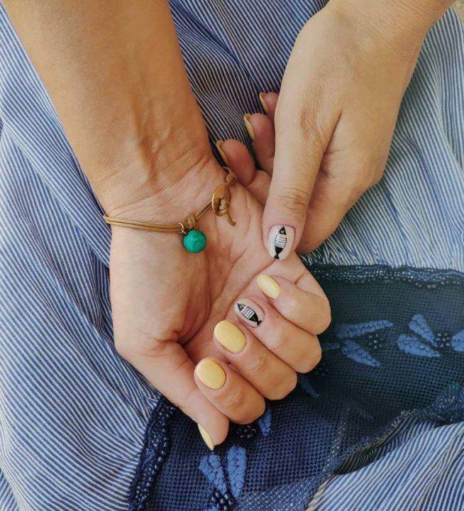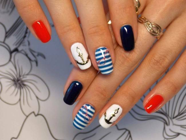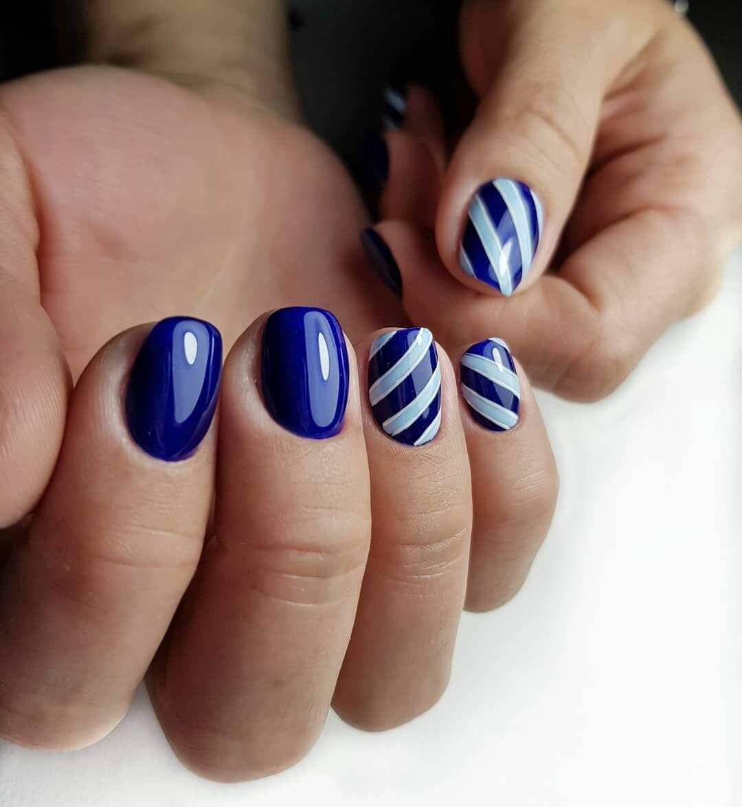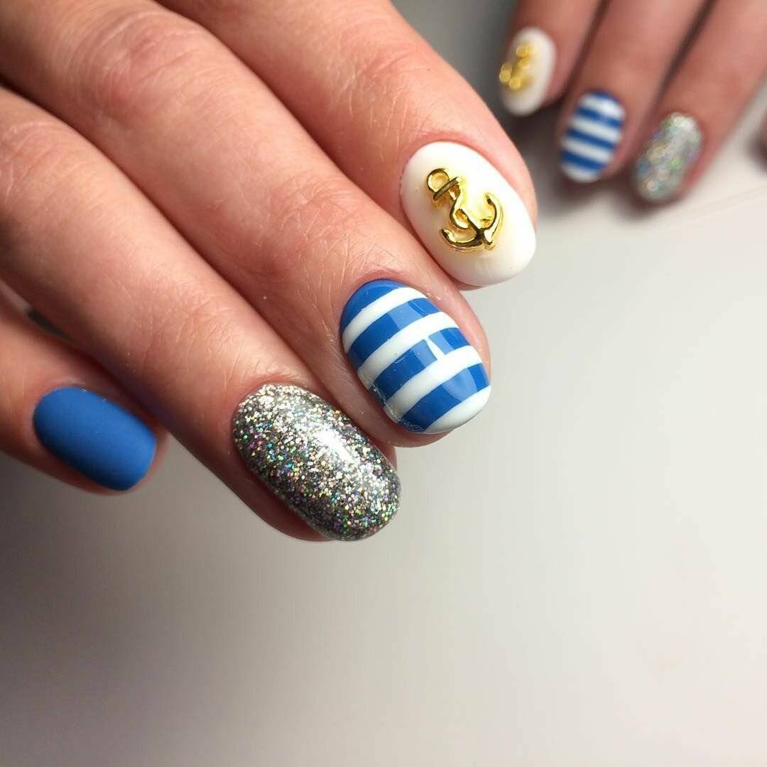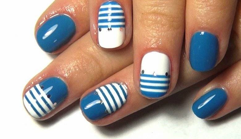 Морская темалетом в целом очень популярна всегда. Ее можно реализовать как в дизайне, так и в различных других проявлениях, например, выбрать лазурный лак для ногтей и нанести только голубые или синие полоски. Это добавит маникюру легкости и свежести.