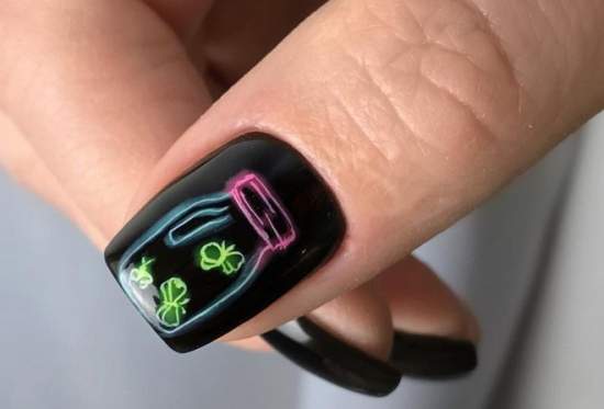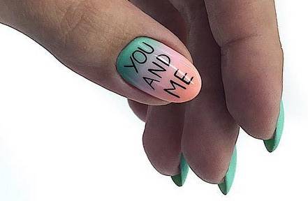 Так в этом сезоне будут модными неоновые цвета и различные надписи, которые идеально сочетаются с длинной формой ноготков. Такой вариант очень популярен среди молодежи.