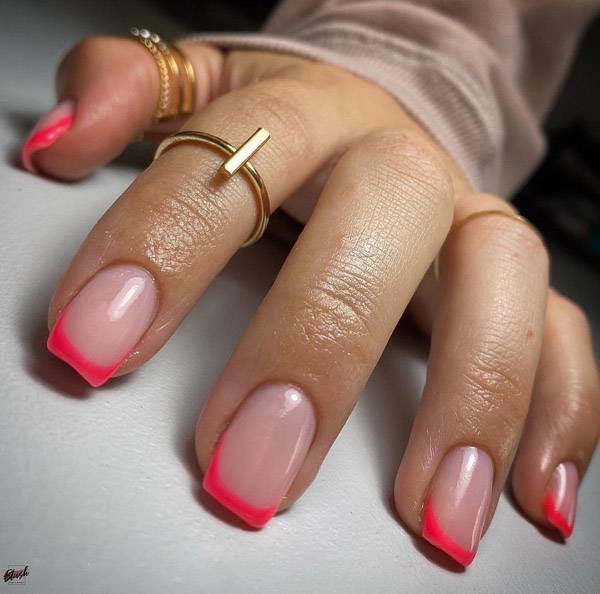 Самое популярное нанесение — это розовый френч с белой зоной улыбки. Также пользуется спросом и однотонное окрашивание ногтей в розовый цвет. В качестве оттенков можно использовать розовый и ярко розовый — фуксию.