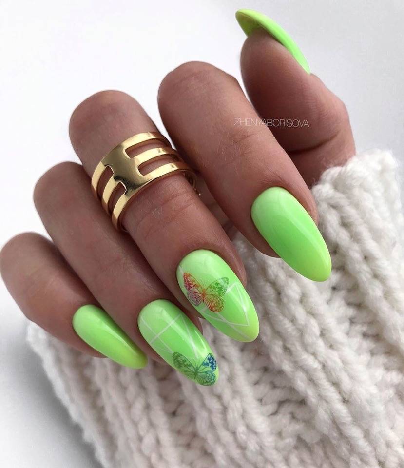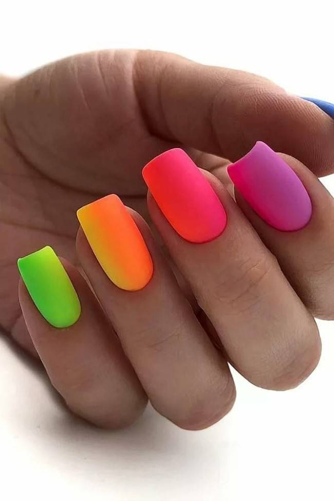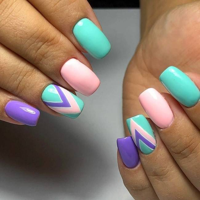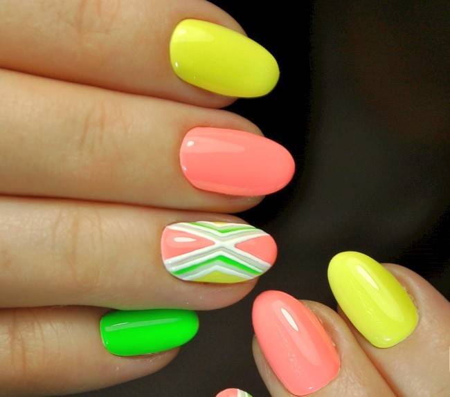 Любительницам лаконичных форм и простых дизайнов в геометрическом стиле в жаркие месяцы стоит добавить немного яркости на ногти. Бело-черные контрасты стоит оставить до холодного сезона, а сейчас попробуйте выполнить маникюр в оттенках лета – сочных и свежих.